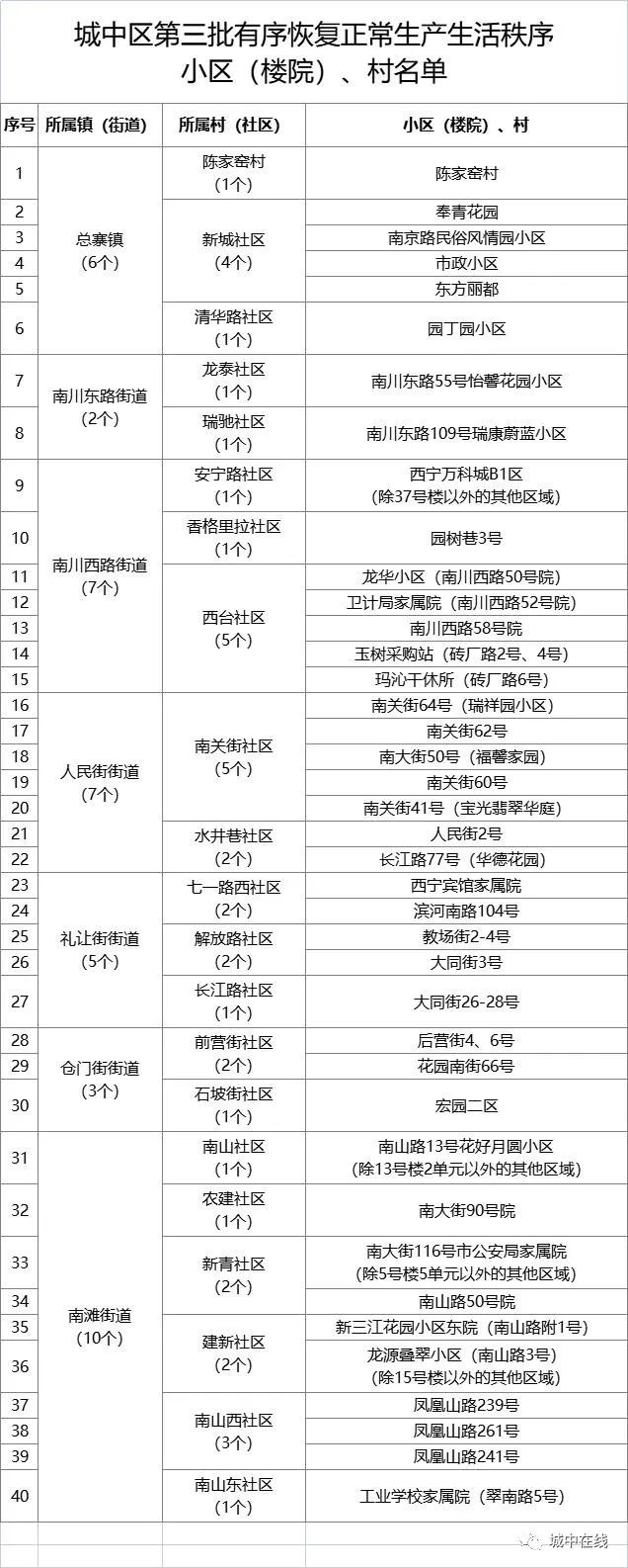 一、自11月11日10时起,解除城中区除管控区域外的40个小区(楼院)、村居家工作生活管理措施,恢复正常生产生活秩序。(具体名单附后)