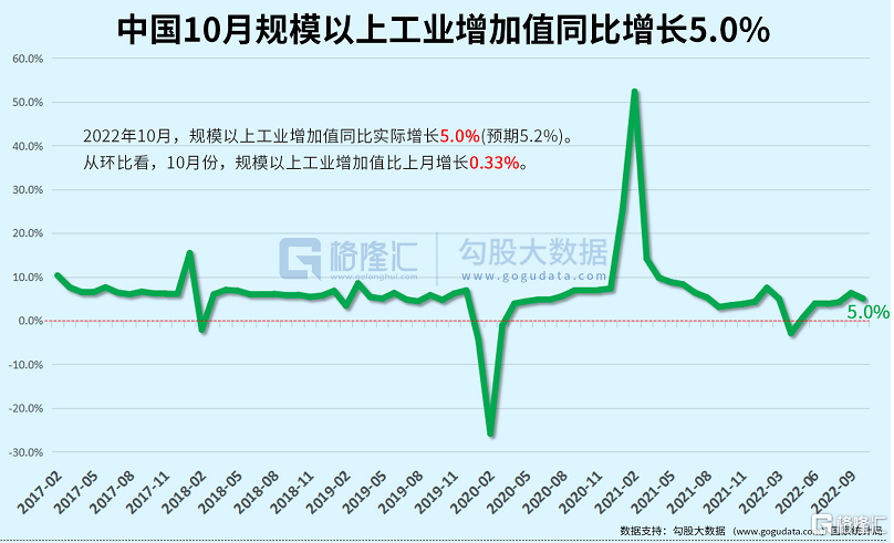 一、工业生产持续增长,高技术制造业增长加快。10月份,全国规模以上工业增加值同比增长5.0%,比三季度加快0.2个百分点;环比增长0.33%。