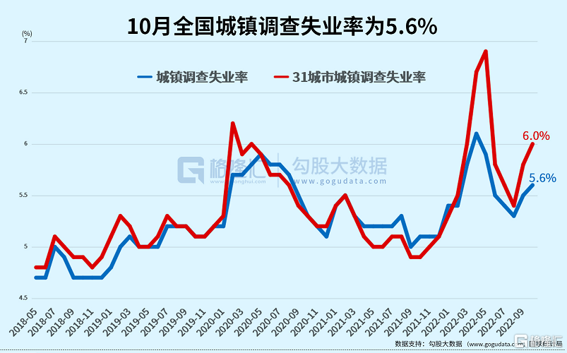 六、就业形势总体稳定,城镇调查失业率与上月持平。1-10月份,全国城镇调查失业率平均值为5.6%。10月份,全国城镇调查失业率为5.5%,与上月持平。