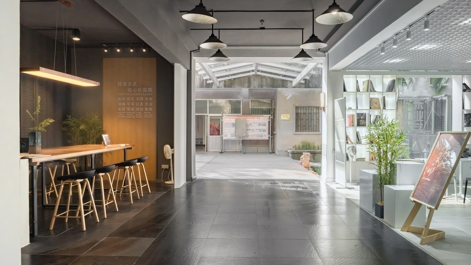 项目面积:“建院书吧”共享交流区改造面积约 25 ㎡,学术沙龙区改造面积约 52 ㎡;“绿色