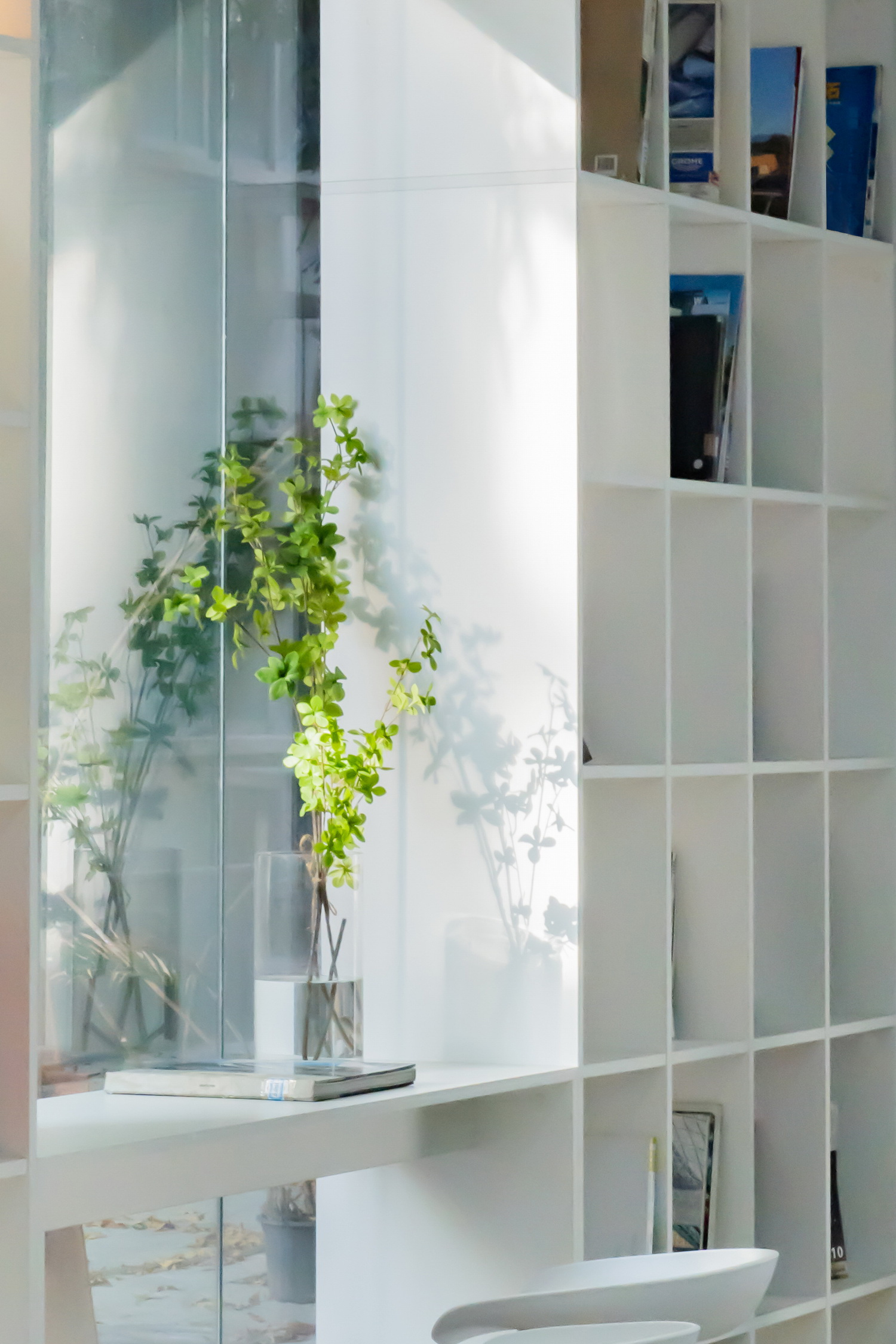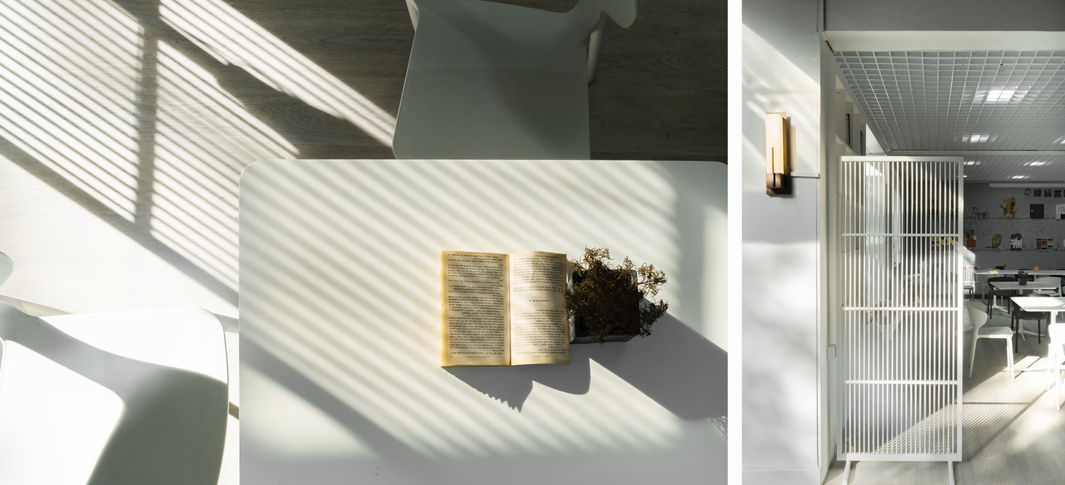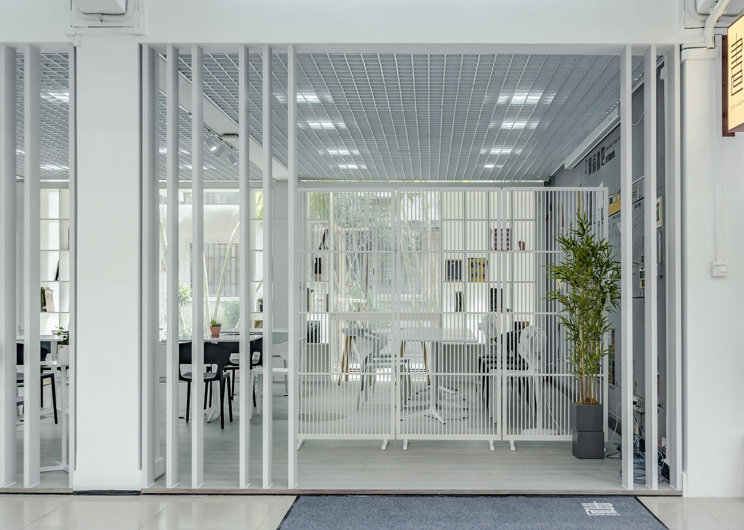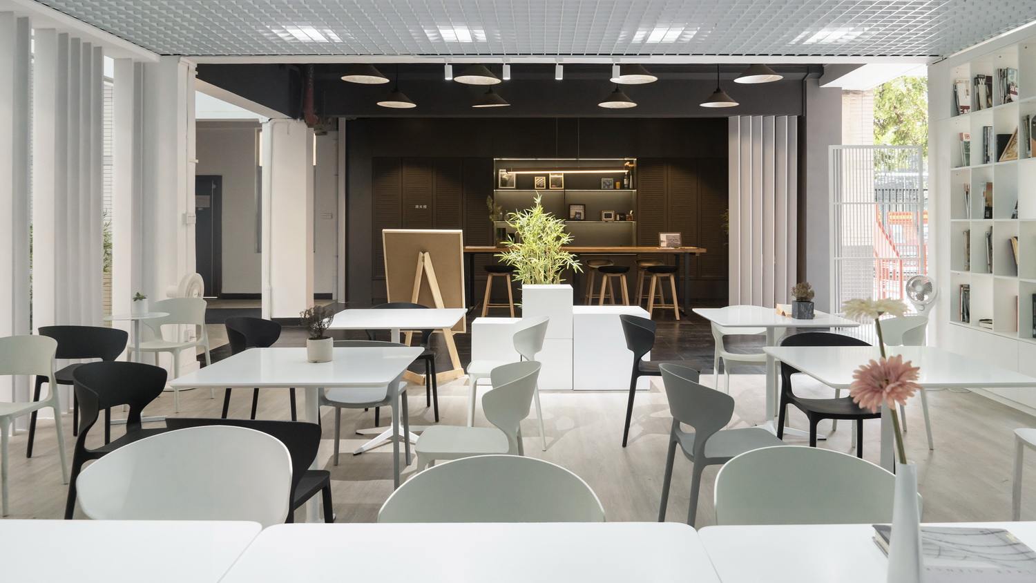 竖向格栅而编织起完整、简约的立面形象;白色书桌和点缀于其间的景观绿植共同渲染出静谧、生动的书香氛围。