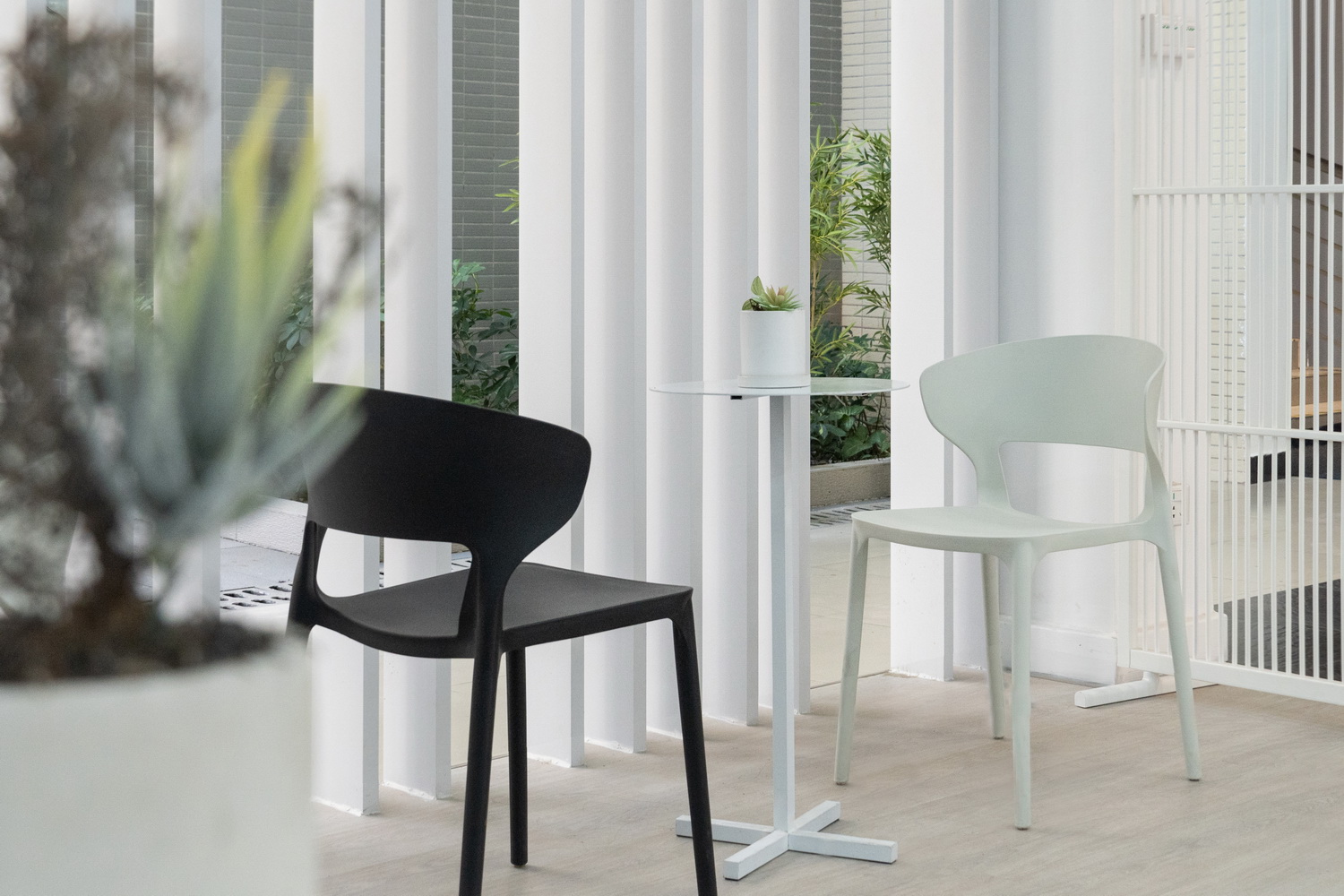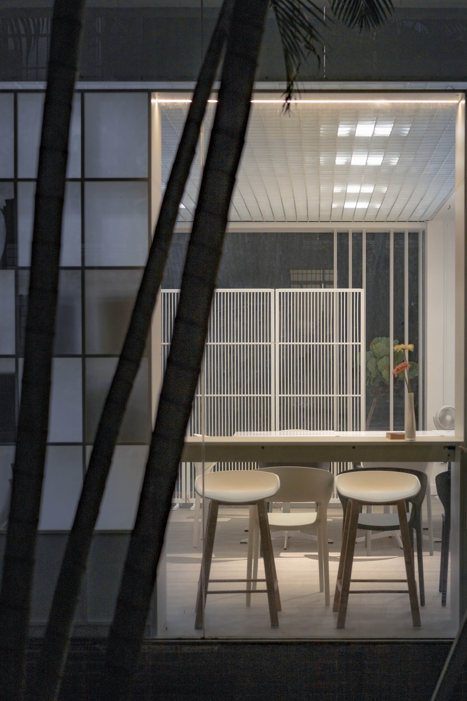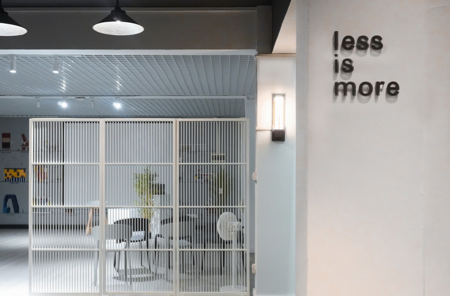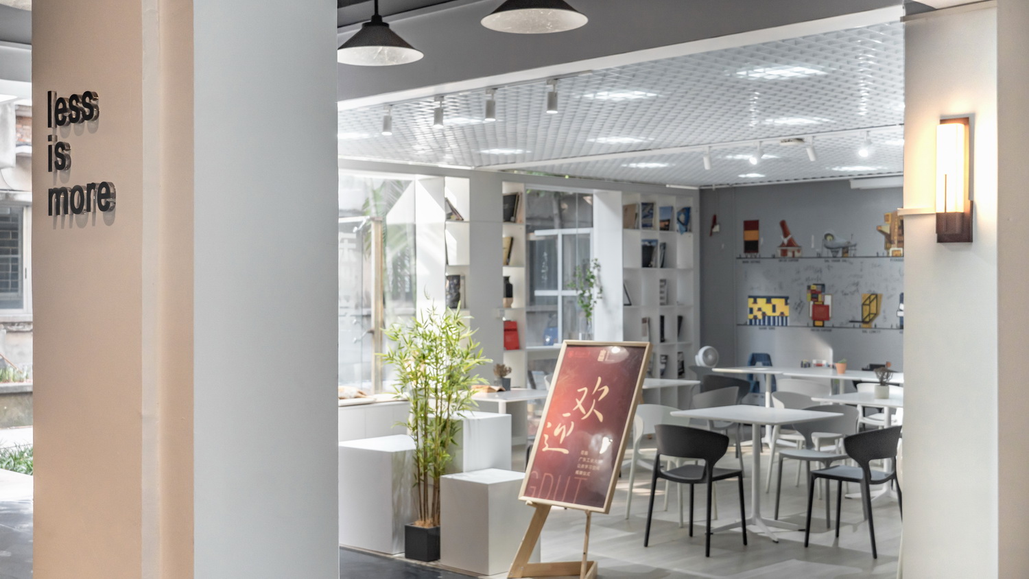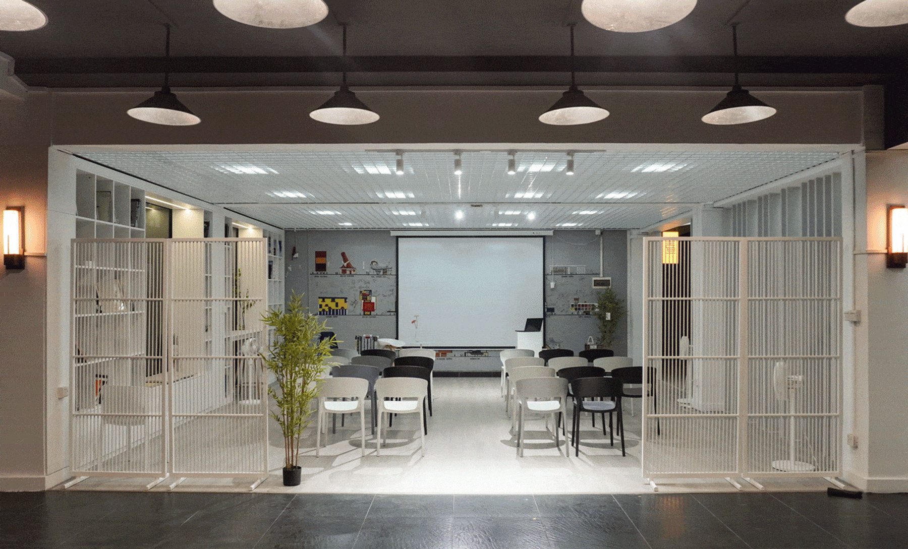 “白盒子”学术沙龙空间不同款式且轻质灵活的桌椅、简约透漏的屏风等为多样化的行为模式提供了可能性。