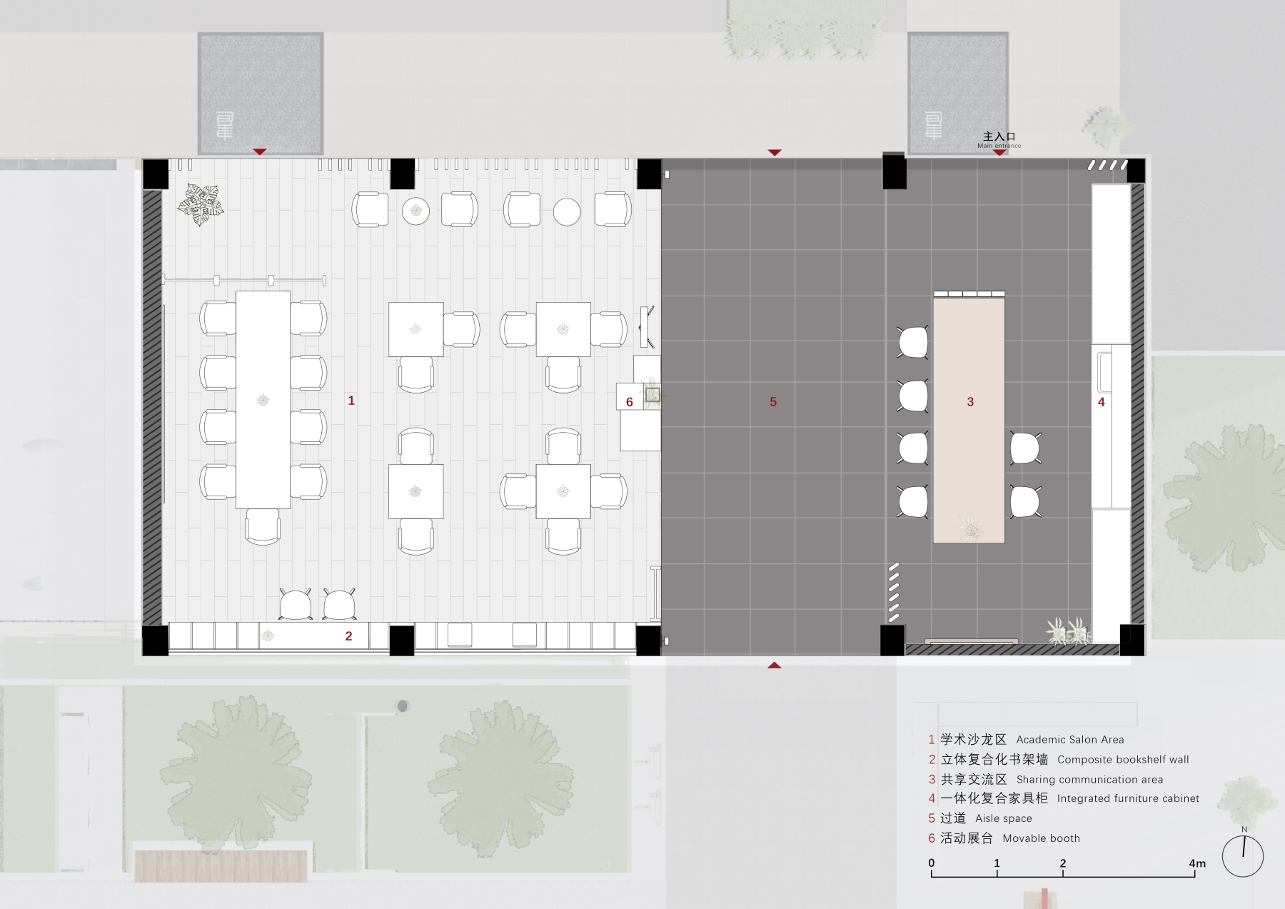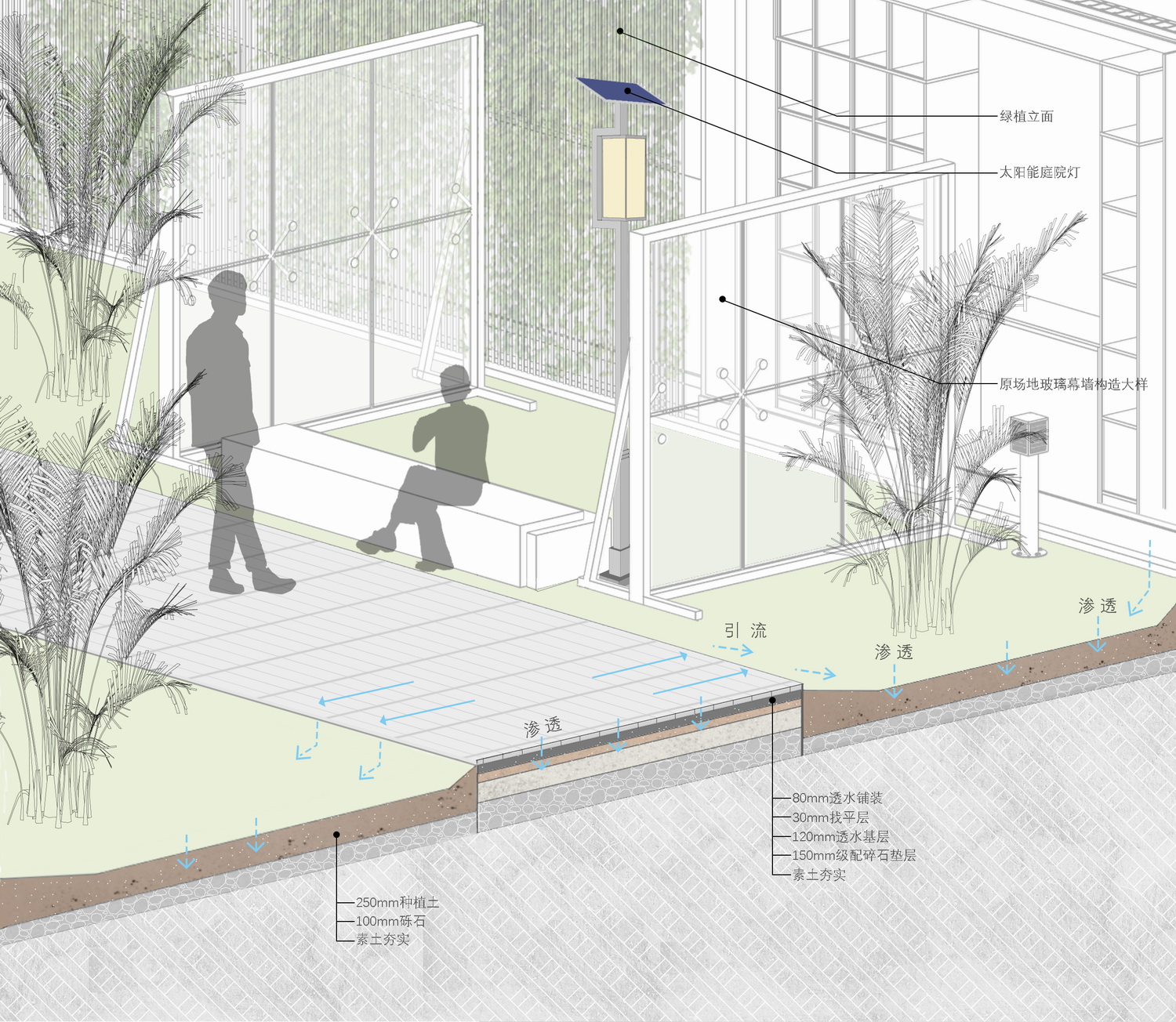 更新方案将“书吧”外部的楼前空地和楼间绿地一体规划整理,形成连续线性“展陈空间+狭院园林”。在此基础上,设计方案融入了绿色可持续发展的理念。